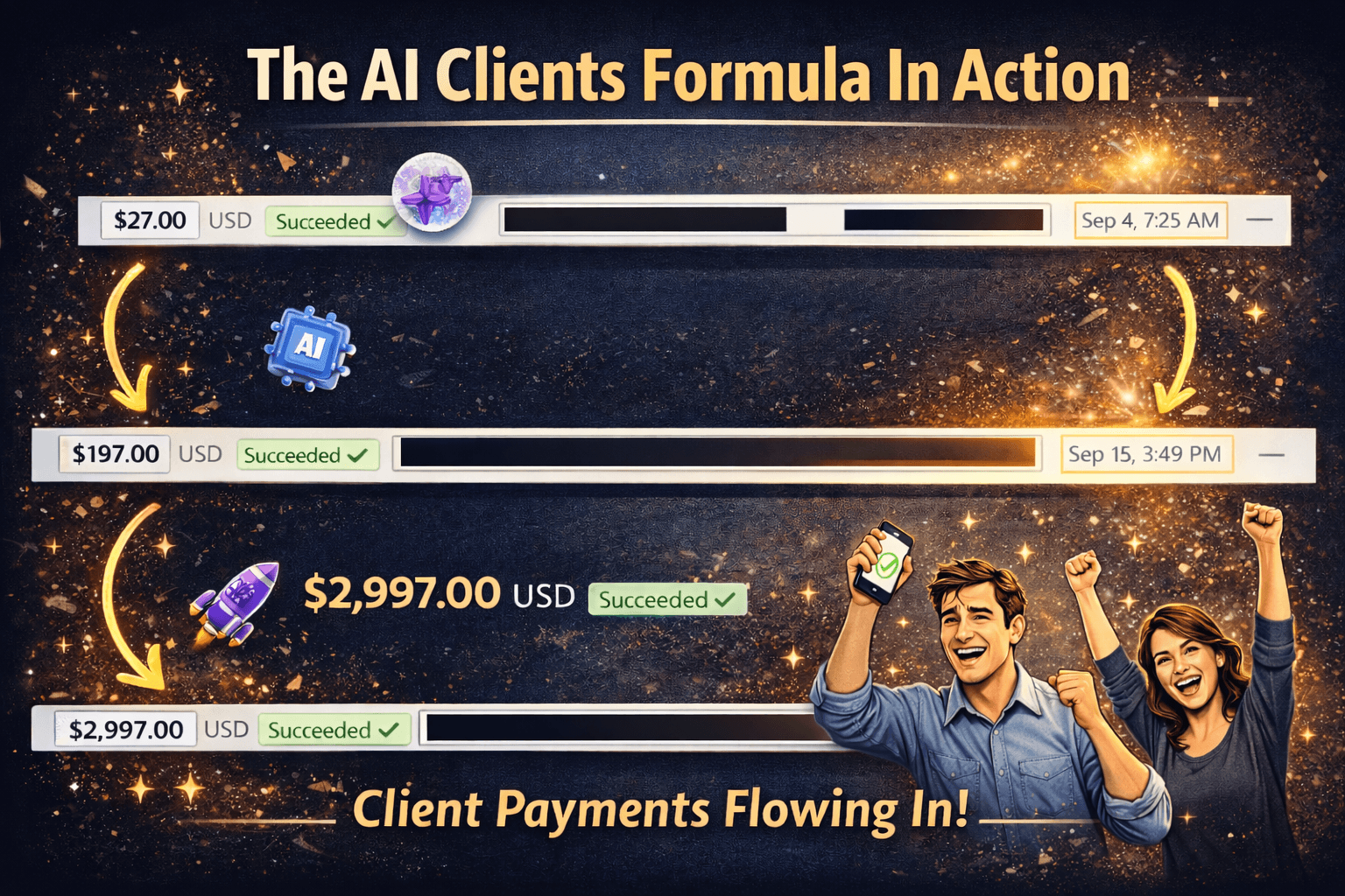 Once installed, the system begins generating $5, $27, $97, and $197 payments from buyers who are already primed for your $3K to $10K high-ticket offer.